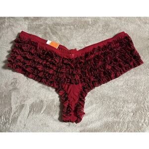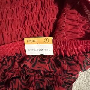 The product is a pair of vintage red and black underwear in size 7 from the brand Fashion Bug. These ruffled underwear are a unique and playful addition to any woman's lingerie collection, featuring a bold color combination that adds a fun and retro touch to any outfit. Perfect for those who appreciate vintage style and want to add a touch of nostalgia to their wardrobe.