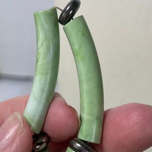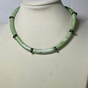 Vintage faux jade acrylic/metal necklace . Each bead is slightly rounded and quite long. Beautiful marbled light green and white. Spring clasp. Has stretched a bit from age. Silver colored metal spacers.