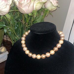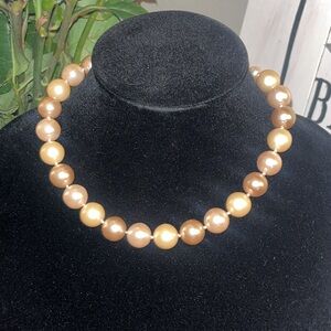 These are from Japan and look like the South Sea large multitone pearls. They don't feel heavy enough to be real but they look very real and have a beautiful luster. There is nothing like them on line, can be worn as a shorter princess length necklace or shorten to wear a choker. The hook clasp in the back is adjustable. This is a perfect set of pearls to add to any outfit and is a must for any wardrobe.