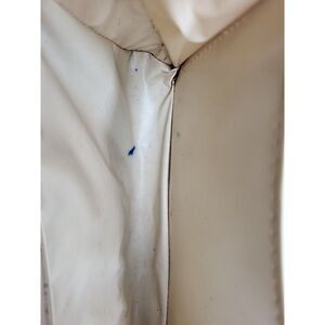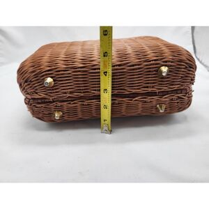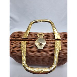 Vintage faux wicker purse/handbag with gold handles and gold feet. No damage to the wicker. Some wear on the gold handles. Has metal latch in great condition. The interior is ivory and has one zipper pocket in the center and on one side. The zippers function as intended and the interior is in great shape for the age. The brand on the label is Gabrielle- Made in Hong Kong. This brand was originally sold at Gimbels in the day.