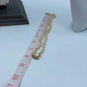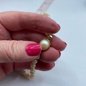 Vintage faux glass pearls. Hand knotted & 16”. No signs of peeling or discoloration. As these are glass they are a little heavy. Slide in clasp.