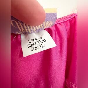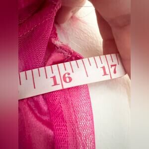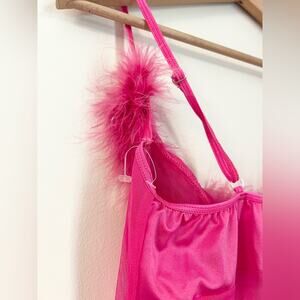 The most adorable vintage lingerie! Hot pink in color with feather lined bust. Small bits of metallic thread detail in the feathers. Mesh and sheer with an underwire bra. Vintage size 1X, probably best fits a large or extra large given the smaller vintage sizing, but see measurements. New without tags. Straps adjust in length. Approx 25 inches in length, 16.5 inches pit to pit laying flat. Good stretch as well.