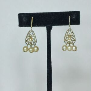 Gorgeous gold tone fillagree earrings with 3 dangle pearls on each earring