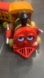 Delight your child with this vibrant wooden train set. Featuring bright red, yellow, and black colors, this toy is perfect for imaginative play. Encourage creativity and fun with this charming train set. One car is missing the blue hook to attach to other train cars and does show paint chipping and wear and tear but still functions fine. Roughly 25 inches long with four train cars tallest train car is a roughly 4 inches tall lowest train car is roughly 3 inches tall.