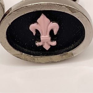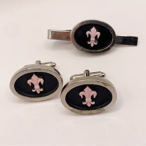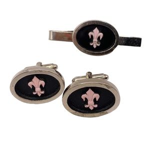 Vintage fleur de lis pink enamel black silver cuff links and tie bar clip