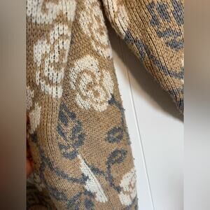 Chunky vintage cardigan. Open style. Floral pattern. Grey and brown in color. There is some mild pilling under the arms. One hole that hasn’t gone through both layers of knit, but worth noting and shown in the photos. Priced accordingly.