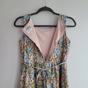 Vintage floral print tiered ruffled maxi dress sleeveless with an adjustable tie waist. In excellent pre owned condition with no signs of wear or damage.