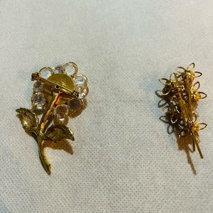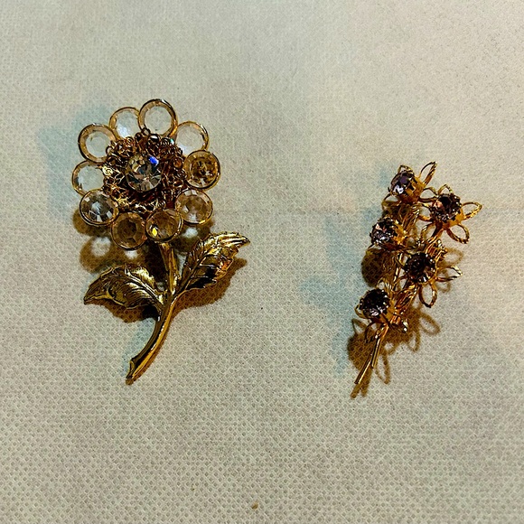 Two brooch set. One has crystal flower petals and gold tone leaves, the other has amethyst stones and gold tone petals.