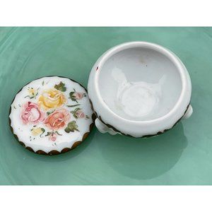 Here for your consideration is a sweet little porcelain footed trinket. The top lid is hand painted roses . It measures 1" tall and has a diameter of 1.5". The paint is slightly charmingly worn. There are no cracks or chips and this is in good vintage condition.