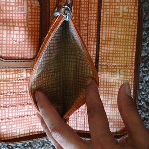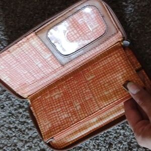 there is one small chip mark on the side of the wallet on the back near the corner. on the back there is also another small mark. and on the inside there is some slight discoloration in the coin pouch from previous coins that where in it. please see pictures. doesn't have a key