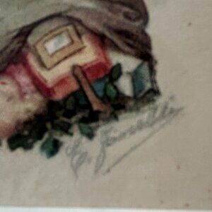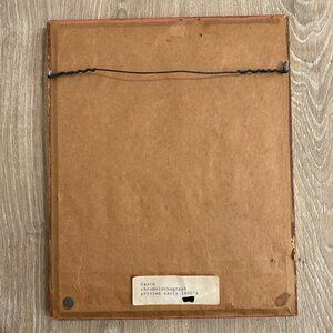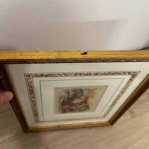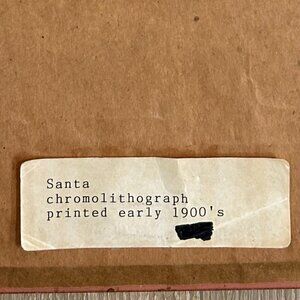 Vintage Christmas art, beautifully framed in a goldtone frame and matted with a Florentine border with shimmery gold detail and covered in glass. On the back is a label that says, "Santa chromolithograph printed early 1900s." Artist signature in lower right of image, but I can't make out the name. The image depicts Santa Claus, with a sack full of toys, filling stockings in front of a fireplace. Wired on back for hanging. Small amount of paint loss on top edge of frame (see last photo). This is a charming piece of holiday decor in overall very good vintage condition.
