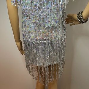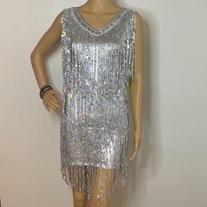 Vintage gatsby silver iridescent sequin fringe mini dress with sequin v neck!