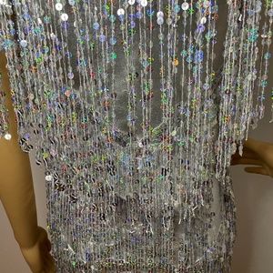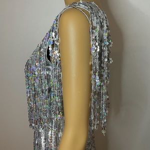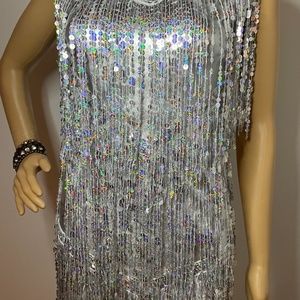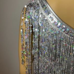 Super swinging sixties and also very 1920’s gatsby metallic spandex sheath mini dress with absolutely stunning and glitzy glamorous fringed iridescent silver fringe from the top with three rows and a fun shoulder that adds extra glam of the lined sequin fringe. The neckline is v neck in the front and back with a collar of sewn on sequins. It’s tight but the fringe adds fun shimmering layers to hide any body worries. The silver lining falls above the knee but the sequin fringe is asymmetrical and falls to the knee for a very sexy peep to the legs with sheer covering. Some of the sequins aren’t perfectly intact but not noticeable unless looking. It’s the ultimate dress for a shining diva! Perfect for nye or a fun party!