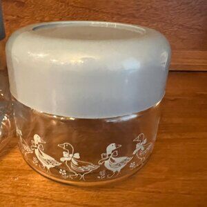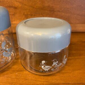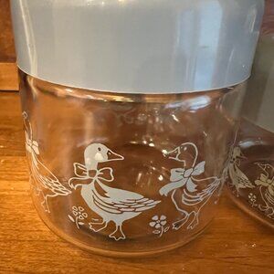 Vintage gemco glass goose canisters with dusty blue plastic lids