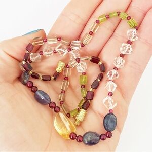 Vintage gemstone beaded necklace- garnet, rock crystal quartz, amethyst, peridot. Beautiful!!! Large center citrine stone- beautiful square faceted rock crystal, garnet round and rectangle beads, peridot rectangle beads and some smoky quartz beads. All stones register as gems on the gem tester. Vintage barrel clasp. 18” long. Excellent condition