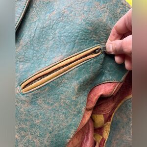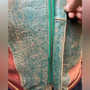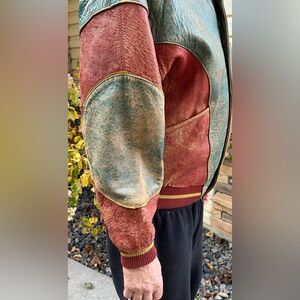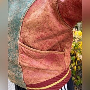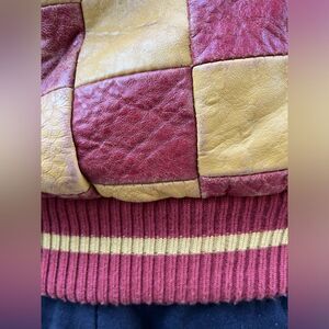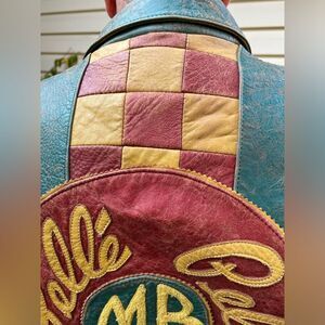 This is a vintage Marc Buchanan Pelle Pelle leather jacket known for its eye-catching patchwork design, blending orange/brown, green, and yellow leather panels. The front features a “Marc Buchanan” label on the collar, along with two slanted, flap-covered pockets. It has ribbed collar and cuffs, adding to its classic bomber jacket style. The jacket shows signs of wear, contributing to its distressed, vintage appeal. The back is adorned with a large “Pelle Pelle MB” logo in bold colors, encircled by a checkered pattern, with “Soda Club” prominently displayed underneath. It closes with both a zipper and snaps for a secure fit.