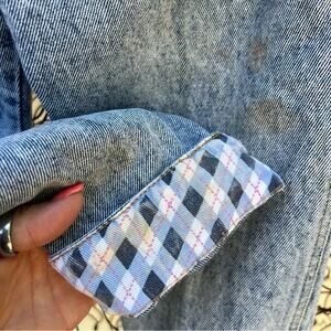 Plaid lining where waistband folds over and where hem cuffs fold up