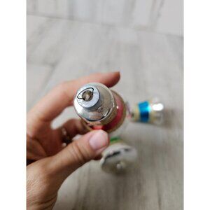 about 3-in tall with a 2-in diameter, does have moderate discoloration on bottom with age spots, good color but does have cracking, scratches and damage throughout the ornament, sold as a set