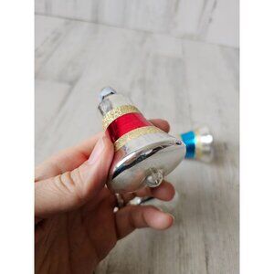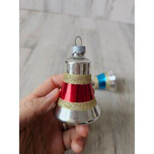 Vintage glitter mercury glass bell ornament gold striped green red blue set Xmas tree