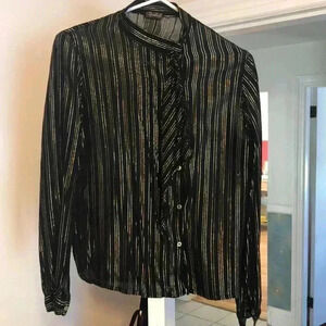 Vintage glittery sheer button down blouse. Great 1980s retro vibe. Black with silver lining. Measurements 18 inches from armpit to armpit and 22 inches in length