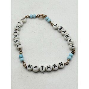 Vintage gold filled beaded name bracelet. Clasp signed 1/20 12k gf. Names read Harvey, Michael, Nathan. Beads and chain link. Vintage bracelet. MN54G.
