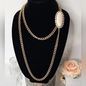 Stunning unique one of a kind long gold tone Cuban link chain with large gorgeous faux opal cabochon surrounded by shiny faux opal rhinestones.