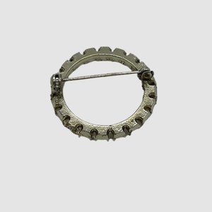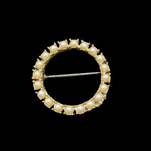 Vintage gold tone and faux pearl circle pin. White faux pearls. Safety clasp. Measures 1 1/4" and in excellent condition.
