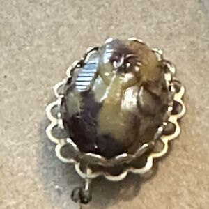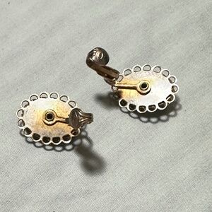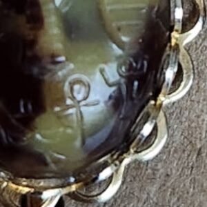Amazing detailed Egyptian earrings! Vintage clip ons in gold tone. Egyptian pharaoh carved onto stone w/4 hieroglyphics underneath. First one is a bird, either falcon or owl & stands for “M” as in man. Second one we think is a basket, which can represent “K” or word “basket“, or related concepts like “Lord” “master” “owner”, possibly something underneath, but unsure. Third one is cross w/loop at top, ankh, means immortality. Furth one is man with arms raised which means determinative of be elevated; height; enjoy oneself; mourn; bald. High ground.