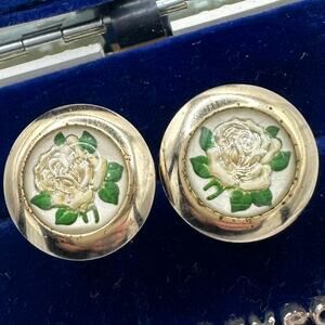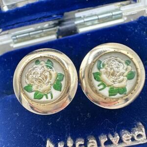 Great vintage condition, minor wear present. These magnificent beauties feature clear domed glass cabochons, carved and painted on the underside in creamy white and bright green roses. Unsigned. Swivel components function perfectly. Unisex. Please see photos for measurements in inches.