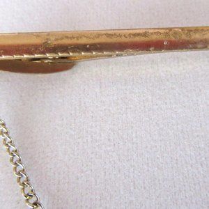 Vintage gold tone metal tie clip tie bar with chain and red stone - Mid Century