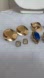 Abstract style goldtone earrings with a smushed design, a diamond shaped pair with black accents, a small goldtone ribbon with a single clear sparkly rhinestone, a picture frame style with a large sparkly rhinestone, Victorian vibe pair with a blue stone in the middle with a scrollwork pictures frame style,