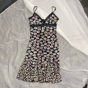 Stunning! early 00s romcom midi. So pretty and effortless. Blue gray with pink florals. Lace trimmed bust and ruffle hem.