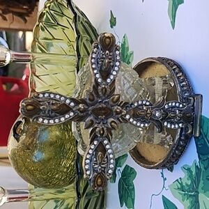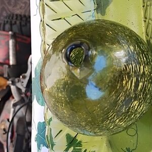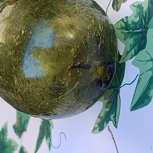 I believe the celery dishes Anchor Hocking 10 in long 5 wide . it is in great some tiny flea bite chips see pics The crackled glass ball has a hole I believe it was used for fishing @ 3 in diameter The Cross is candle holder isfrom Bombay Co I believe It is also vintage and has a candle in a crystal or glass dish The small green1 votives are glass with clear stems 5 in tall