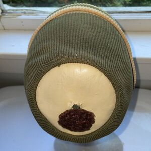 Vintage green & tan knit beanie cap with unique vinyl circle & pom pom on top