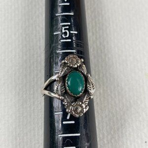Vintage green turquoise Prairie Fire sterling silver ring with leaves. In good, used condition, see photos. Some scratches and other inidcations of wear and use consistent with age. Still a beautiful ring. About a sizse 6 1/2.