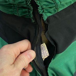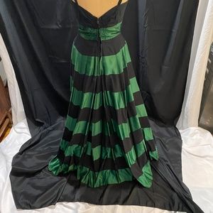 Vintage green&black - evening gown - in good condition for age , some fading and stain on fabric see pictures - zipper still works but is detached - see pic - bow is also detached - see pic . miss registered original design F.O.G.A. Comes from a theaters collection , would have been dry cleaned after use - was in storage , than has been sitting in my closet for 10 years has not been dry cleaned since . Is in good vintage condition . It is vintage , sold as is . Is on mannequin / dress form with measurements of bust 34”/ waist 24” / hips 34”