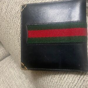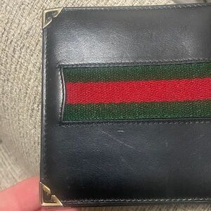 Vintage black leather card holder by Gucci. Features bold red and green stripe.