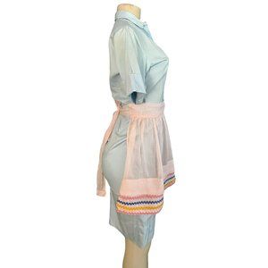Vintage half apron 1950s women kitchen apron with zig zag pattern in pink blue.