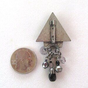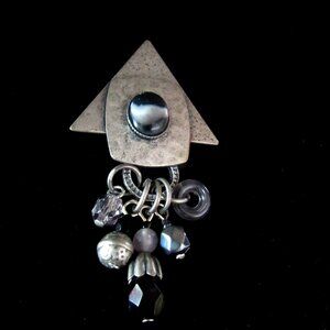 Vintage hammered pewter tone geometic metal brooch with dangling beads-lapel pin
