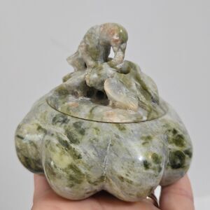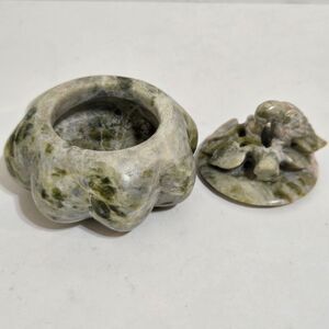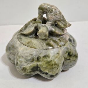 Vintage hand Carved Green Soapstone Bird On leaves Trinket Box 3" tall Stone