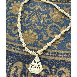 Vintage hand carved Elephant necklace tribal ethnic. I believe this is hand carved bone. It has a large elephant pendant but look close at the tiny carved elephant beads. About every forth bead or so. I took close up pics. One of a kind piece.