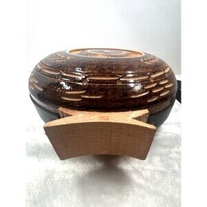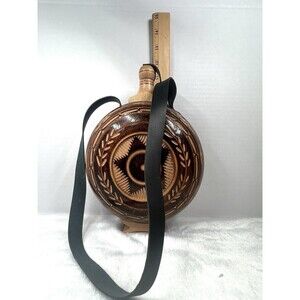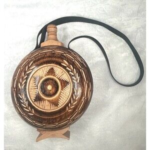 This vintage hand-made folk carved wood brandy flask canteen is a unique addition to any collection. The flask is beautifully crafted with a leather strap, making it a great addition to any collection of bottles and insulators. The flask is perfect for those who appreciate the beauty and artistry of hand-made items.