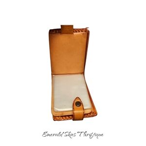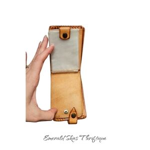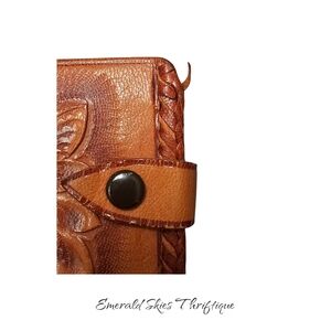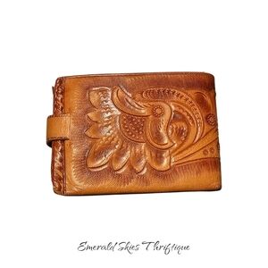 Vintage hand tooled leather wallet in guc. Top of one edging is loose, see pictures for condition details.