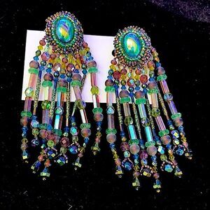 Incredible beautiful iridescent blue huge beaded chandelier earrings. These designer earrings were made by jewelry designer Lisa Jo Silberkleit of Sonoma, California. The earrings have a vintage blue iridescent glass center surrounded by ab peacock glass faceted glass beads, the dangling strands are comprised of more ab beads, faceted and iridescent in blue, purple, green, ab pink and fiber wrapped bugle beads. The earrings measure 4.5” x 2”. Just stunning, please see all photos for full description.