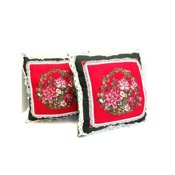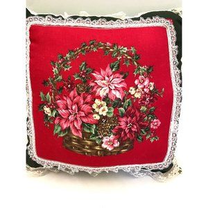 Vintage handmade throw pillows trimmed in lace, basket of poinsettia's on front of pillows, great Xmas through pillows