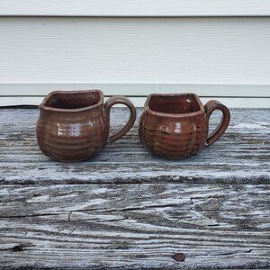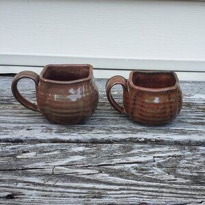 There is a big and small mug. They are handmade and stamped. They are so cute and unique. Awesome condition. One is 3 inches tall and the other 2 inches tall.Comes from a non-smoking house.