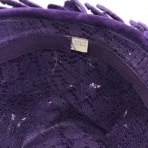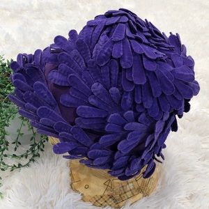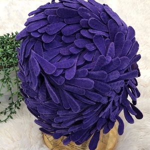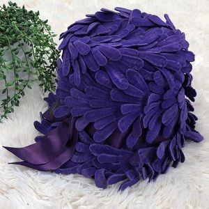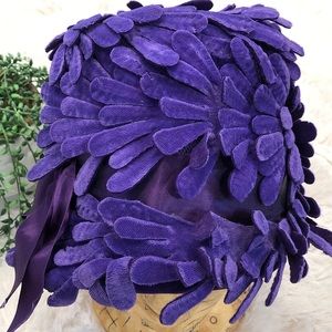 A vintage, purple, velour like hat with purple satin ribbon, a little dirty on inside rim, a few petals are bent from storage, otherwise in good vintage condition.