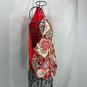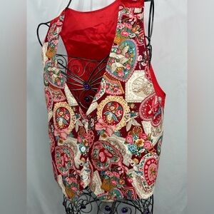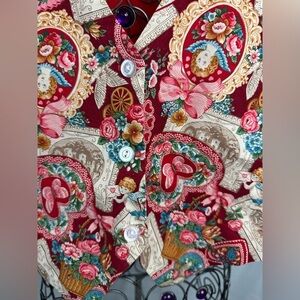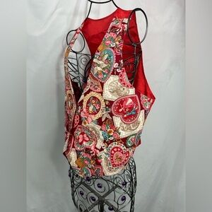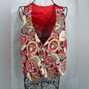 Add a touch of vintage charm to your wardrobe with this heart and cherub button-down vest. Perfect for layering over any outfit, this vest offers a unique style statement.