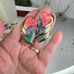 Vintage heart dangle enameled long earrings. Three hearts linked and each move. Slight tarnish on backs.