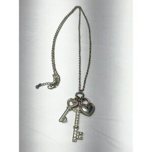 Vintage heart keys charm pendant necklace. Hanging heart and rhinestone key charms. Silver tone chain necklace. MN53FG.